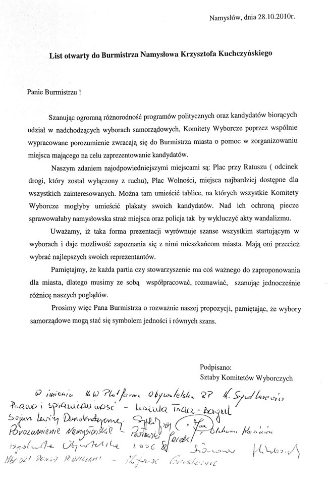 Sztaby wystosowały również list otwarty do burmistrza Namysłowa w sprawie ustawienia w rynku tablic, na których komitety mogłyby zaprezentować plakaty wyborcze.