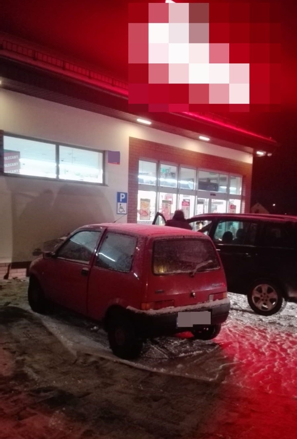 W piątek po godzinie 17. w Domaszowicach 60-letnia kobieta kierując fiatem cinquecento straciła panowanie za kierownicą i wjechała w elewację miejscowego marketu. Prędkość, pomimo obfitych opadów śniegu, miała tak dużą, że zdołała jeszcze przejechać przez chodnik, pas zieleni, cały parking i zatrzymała się dopiero na ścianie sklepu.