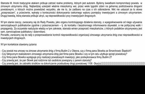 Oprócz zarzutu wykorzystywania samorządowych publikatorów niezgodnie z przeznaczeniem, opozycja wypomina Michałowi Ilnickiemu nieprawidłowości organizacji zimowego utrzymania dróg oraz nieprawidłowości w inwestycjach drogowych. W tych ostatnich tematach zwraca się się do Rady Powiatu o przeprowadzenie kontroli. Rada zapewne ustosunkuje się do pisma na najbliższym posiedzeniu, które odbędzie się pod koniec marca br.