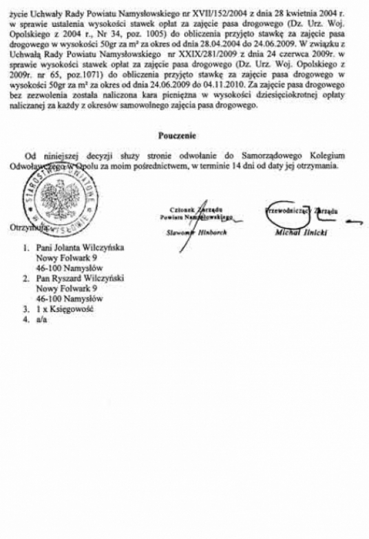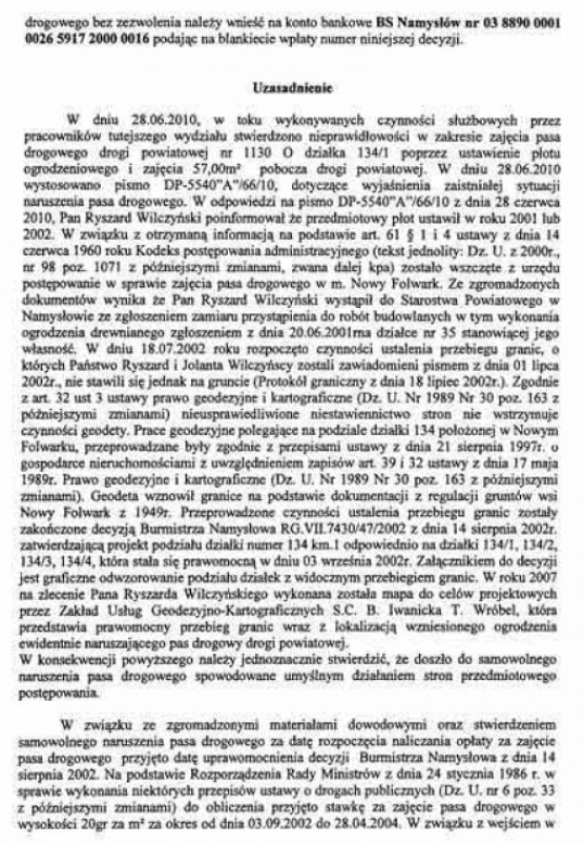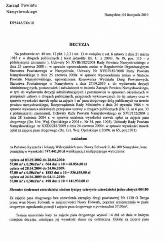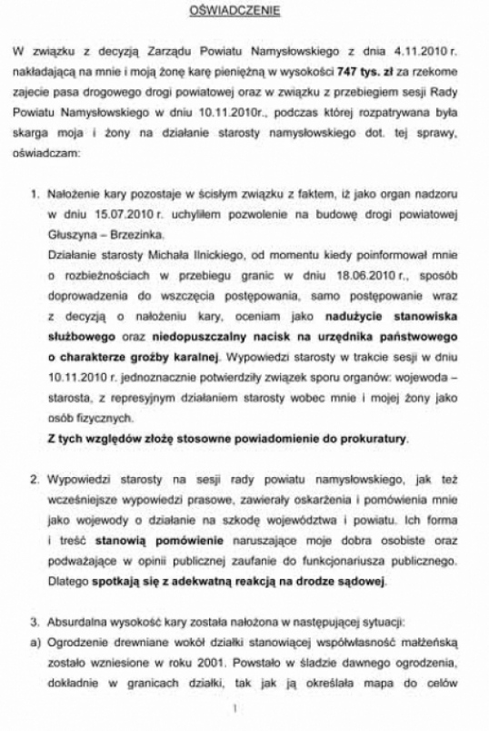 Całość oświadczenia publikujemy poniżej. Ponadto przedstawiamy Decyzję starosty namysłowskiego o nałożeniu kary.