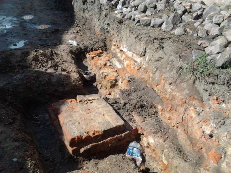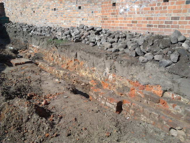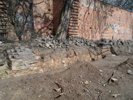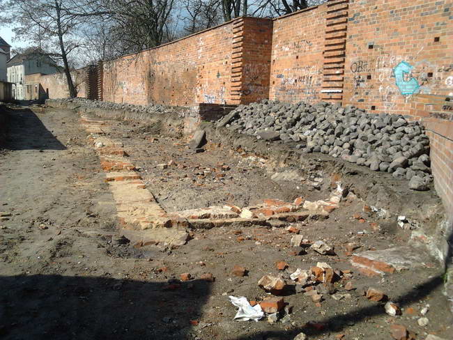 W prima aprilis udało mi się zrobić kilka fotografii tego, co odkopano przy ulicy Piastowskiej, tuż za komórkami i garażami. Niedługo później zasypano pozostałości budynków.