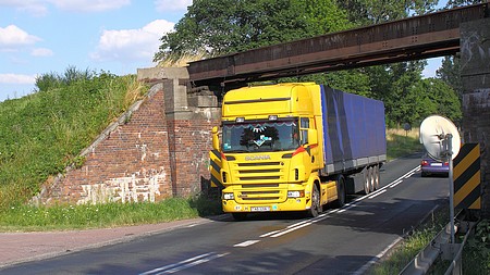 Mieszkam już w tym mieście 50 lat, a okazuje się, że nie znam dobrze najbliższej okolicy. Pojechałem dzisiaj w końcu sprawdzić, ile Kamienna ma tych wiaduktów. Miejscowi wyjaśnili mi, że trzy i jeden most nad linią kolejową do Bukowy Ślaskiej. Nie ufam tak do końca tym relacjom tubylców i sprawdzam w leksykonach i encyklopediach hasło wiadukt. I wszystko się wyjaśniło, bo wiadukt to rodzaj mostu nad drogami i torami kolejowymi. Kamienna - jak w tytule - ma tych obiektów aż cztery. Pierwszy "prowizoryczny" przebiega nad droga krajową nr 42 Namysłów - Kluczbork. Zrobiłem pod wiaduktem cztery fotki z TIRAMI. Dwie rejestracje nasze, dwie obce - Litwa i Białoruś. Wybrałem najładniejszą żółtą scanię z Białorusi.