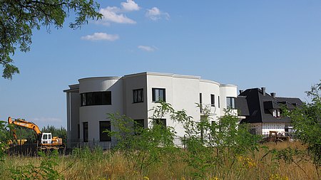 Jechałem nowym asfaltem w Kamiennej, bo piękny bruk urywa się ok. 200 m za wiaduktem, aby zobaczyć postępy przy budowie mostu na Widawie na drodze Stare Miasto - Kamienna. A tu nagle wyskoczyła mi taka nowoczesna villa ala Corbusier. Podjechałem spokojnie do tablicy inwestora znajdującej się w głębi posesji - pewnie znowu naruszyłem prawo:) i odczytałem: Inwestor - Zbigniew Pabiniak; kierownik budowy - jak zwykle - Krzysztof Wnuk.
