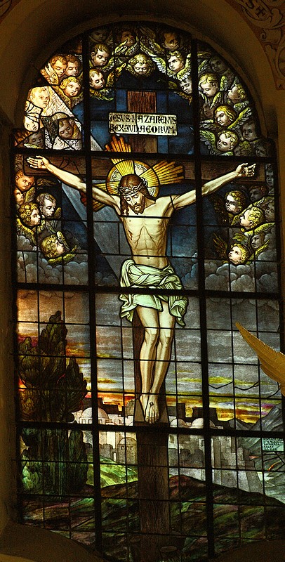 Wielkie wrażenie robi główny witraż kościoła pw. Podwyższenie Św. Krzyża. Fotografia zrobiona tuż przed koncertem.