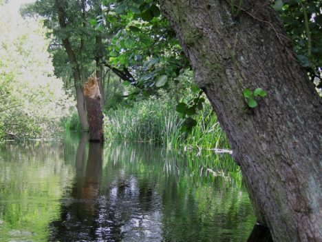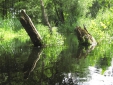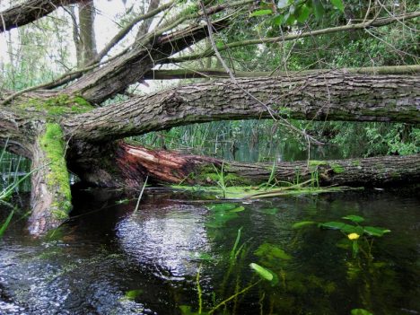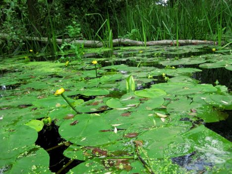 W głębi olcha świeżo powalona przez bobry. Piękniejsze są jednak w pierwszym planie grążele
