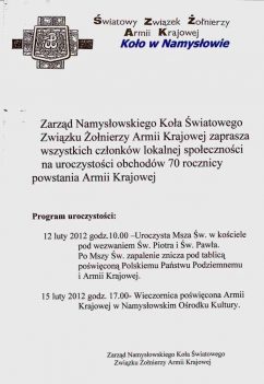 Zarząd Namysłowskiego Koła Światowego Związku Armii Krajowej zaprasza wszystkich członków lokalnej społeczności na uroczystości obchodów 70 rocznicy powstania Armii Krajowej.