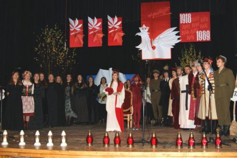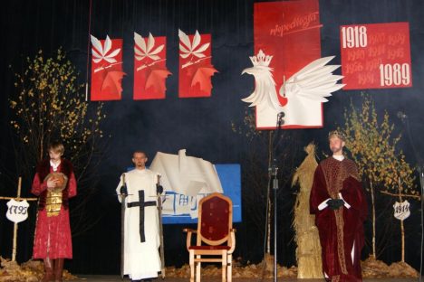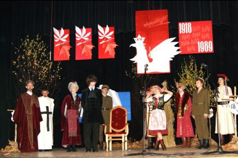 Po przybyciu do Namysłowskiego Ośrodka Kultury wysłuchaliśmy okolicznościowych przemówień i wiązanki patriotycznych pieśni w wykonaniu Namysłowskiej Orkiestry Dętej pod kierownictwem Pana Antoniego Szydłowskiego. Przede wszystkim jednak część artystyczna w wykonaniu młodzieży Gimnazjum Nr 2 z Oddziałami Dwujęzycznymi w Namysłowie pokazała, że Święto Niepodległości można świętować nie tylko biegając, maszerując czy wyjeżdżając, ale można świętować w swojej małej ojczyźnie ze łzami wzruszenia w oczach.