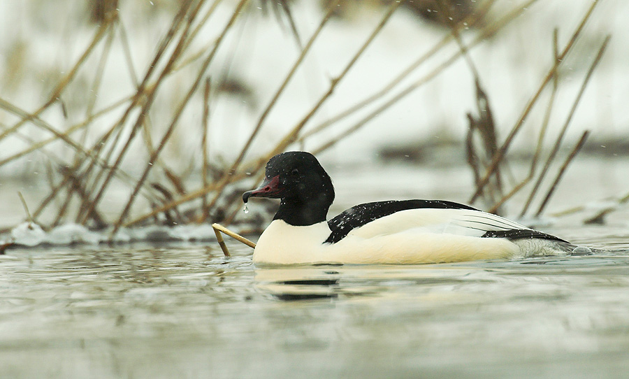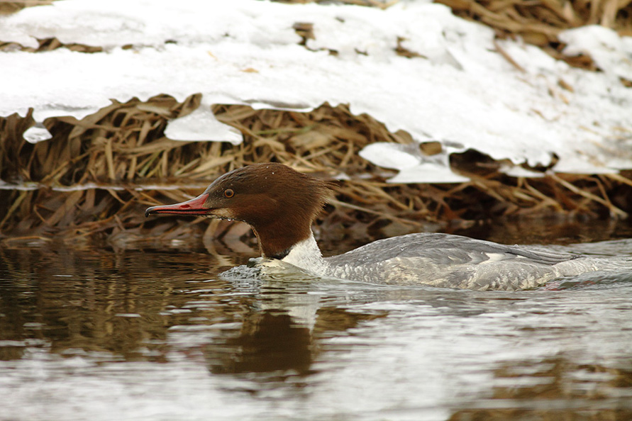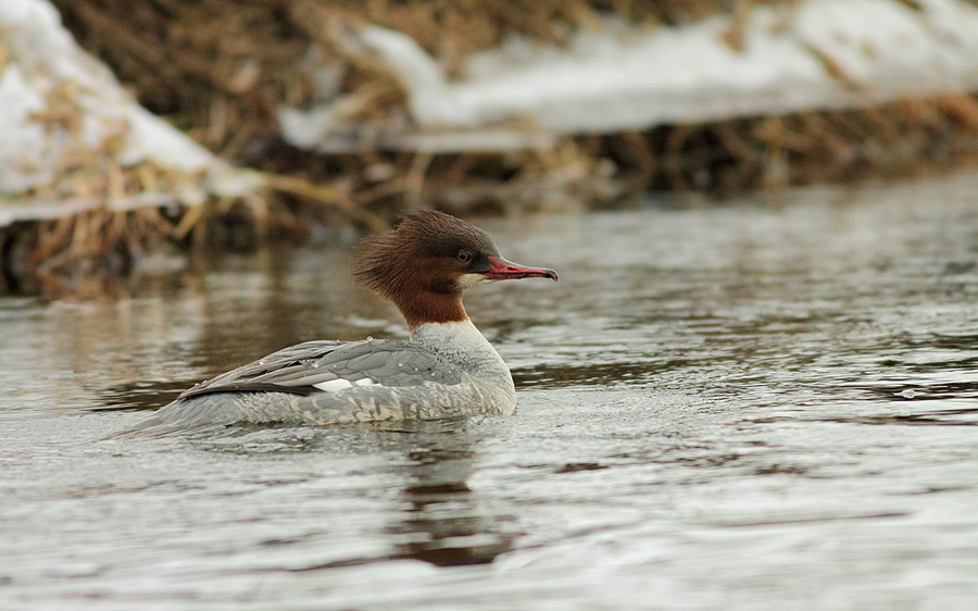 Do mostu pod Wilkowem stado krzyżówek i przelatujące kormorany i mnóstwo śladów wydry. Na wysokości Ligotki na prostym odcinku Widawy nie widać żadnego ruchu- trudno ,wracam. Wróciłem do punktu wyjścia. Spoglądam na zegarek, jeszcze sporo czasu do dyspozycji no to idę w stronę Lubskiej. Wszędzie widać ślady wydry, żywej niestety niewidać. Notuję natomiast w których miejscach wychodzi na brzeg. Na śniegu widać to doskonale. Spacer przerywa jakaś wrzawa kilkaset metrów dalej za zakolem rzeki. Stado krzyżówek zrywa się do lotu. Niemożliwe abym to ja je spłoszył, a same bez przyczyny nie zerwały by się całym stadem. Pewnie lis myślę sobie, ale zerkam w górę a tu bielik wali z góry w pogoni za obiadem. Kaczki się rozproszyły i z posiłku nici. Klnę w duchu na bielika, że tu ugania się za kaczkami a kilkanaście kilometrów stąd czeka na niego gotowy posiłek podany na talerzu. Na tym kończę swój marsz, skoro bielik przegonił krzyżówki to pewnie nurogęsi tam też nie ma. Już miałem jechać w kierunku Michalic, ale coś mnie skusiło żeby pojechać na wyspę, i całe szczęście. Pływają sobie skubane w pobliżu wodospadu ale podejść do nich nie sposób a czas już nie pozwala na dłuższe czatowanie więc przekładam to na następny dzień.