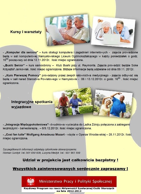 Nasza organizacja uzyskała dofinansowanie z Ministerstwa Pracy i Polityki Społecznej w ramach programu „Aktywizacji Społecznej Osób Starszych”. Program ten skierowany jest do osób powyżej 60 roku życia. Nasze stowarzyszenie organizuje projekt pt. "Edukacja Międzypokoleniowa" w którym proponujemy Państwu cykl wykładów, kursów, weekend w Lądku Zdroju oraz wyjazd do Opery we Wrocławiu.
