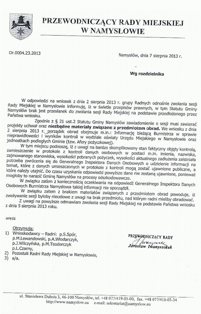 Kolejny wniosek sześciu radnych w sprawie zwołania sesji "nadzwyczajnej" w sprawie Afery Pożyczkowej spotkał się z odmowną (nieprawną) decyzją Przewodniczącego Iwanyszczuka.