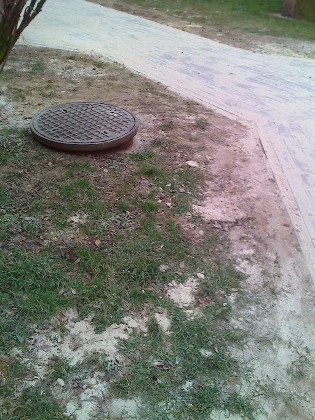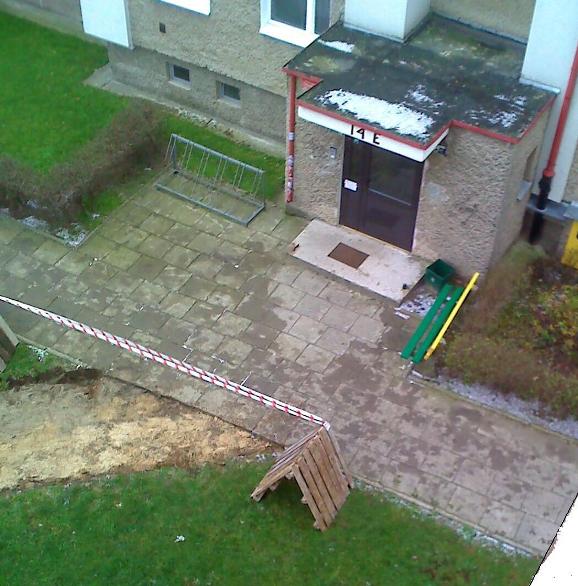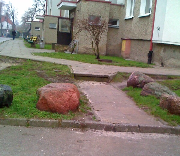 2. Nie zachowano widocznego i wymaganego nachylenia chodnika w kierunku od budynku do pobliskiego trzepaka i boxu śmietnikowego oraz w kierunku do ulic w których znajdują się kratki odprowadzające wody z opadów atmosferycznych.