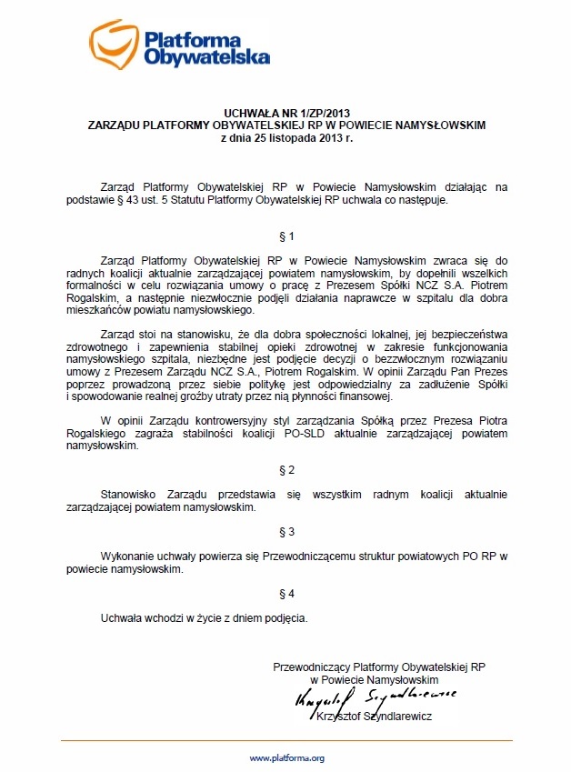 Do redakcji Namyslowianie.pl wpłynęła informacja o uchwale zarządu namysłowskiej Platformy Obywatelskiej wyrażającej stanowisko w sprawie odwołania ze stanowiska prezesa namysłowskiego szpitala.