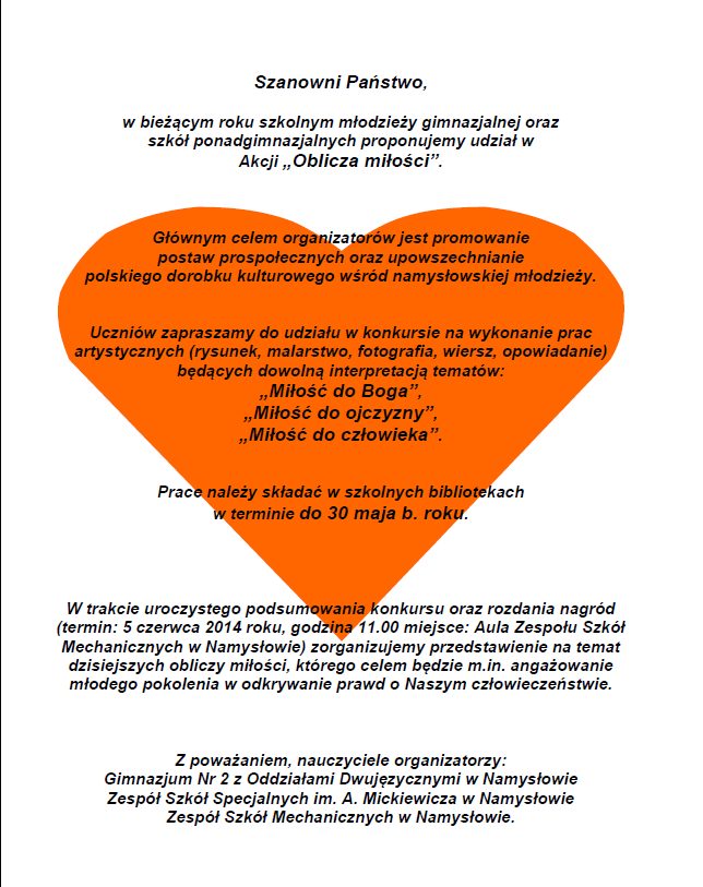 w bieżącym roku szkolnym młodzieży gimnazjalnej oraz szkół ponadgimnazjalnych proponujemy udział w Akcji „Oblicza miłości”.