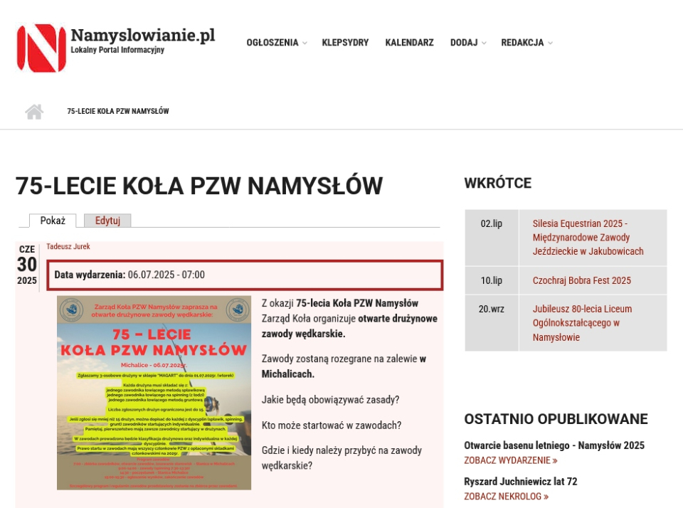 Namysłowskie Koło Polskiego Związku Wędkarskiego z okazji jego 75-leia organizuje otwarte drużynowe zawody wędkarskie.