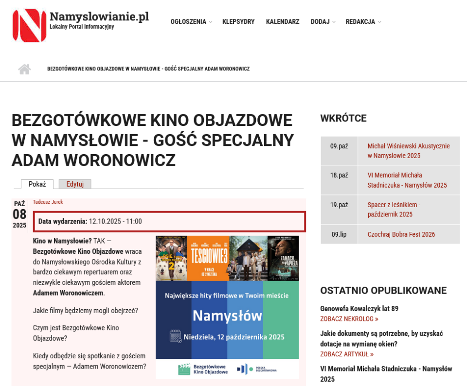 Kino w Namysłowie? TAK — Bezgotówkowe Kino Objazdowe wraca do Namysłowskiego Ośrodka Kultury z bardzo atrakcyjnym repertuarem oraz niezwykle ciekawym gościem aktorem Adamem Woronowiczem.