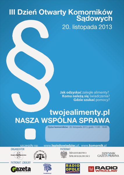 Komornicy z Dolnego Śląska i Opolskiego w ramach Dnia Otwartego 20 listopada 2013 roku w godzinach od 11.00 do 18.00 bedą udzielać bezpłatnych porad prawnych wszystkim zainteresowanym problemami związanymi z egzekucją sądowa, z odzyskaniem należności alimentacyjnych, z zasadami przyznawania i otrzymywania świaczeń z Funduszu Alimentacyjnego.