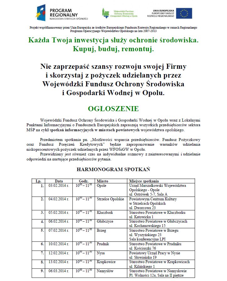 O pożyczkach z WFOŚiGW dla MSP - Namysłów 6 marca 2014