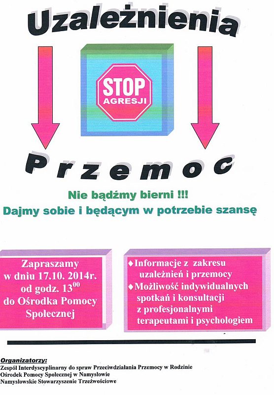 Osoby zainteresowane będą mogły skorzystać z pomocy i porad specjalistów z Ośrodka Pomocy Społecznej, Zespołu Interdyscyplinarnego do spraw Przeciwdziałania Przemocy w Rodzinie a także Namysłowskiego Stowarzyszenia Trzeźwości owego.