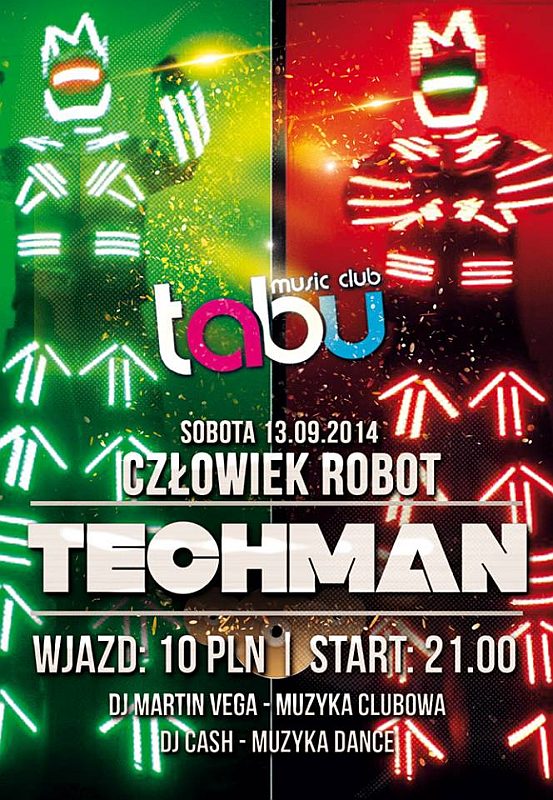 Tego wieczoru dyskotekę TABU odwiedzi 2,5 metrowy, oświetlony setkami ledów robot, uzbrojony w lasery, wyrzutnie CO2 oraz ładunki pirotechniczne TECHMAN - człowiek robot.