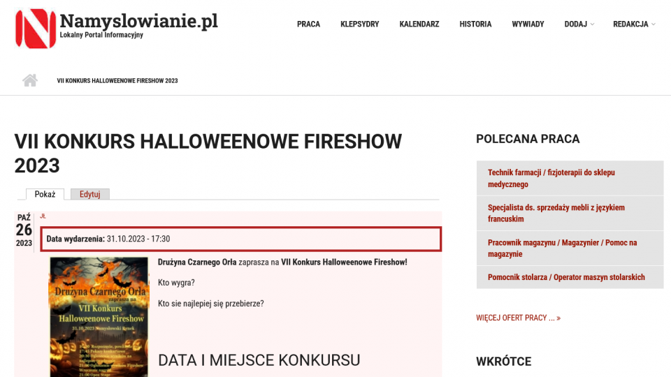 Konkurs będzie miał miejsce 31 pażdziernika 2023 roku, w Halloween, na namysłowskim Rynku.